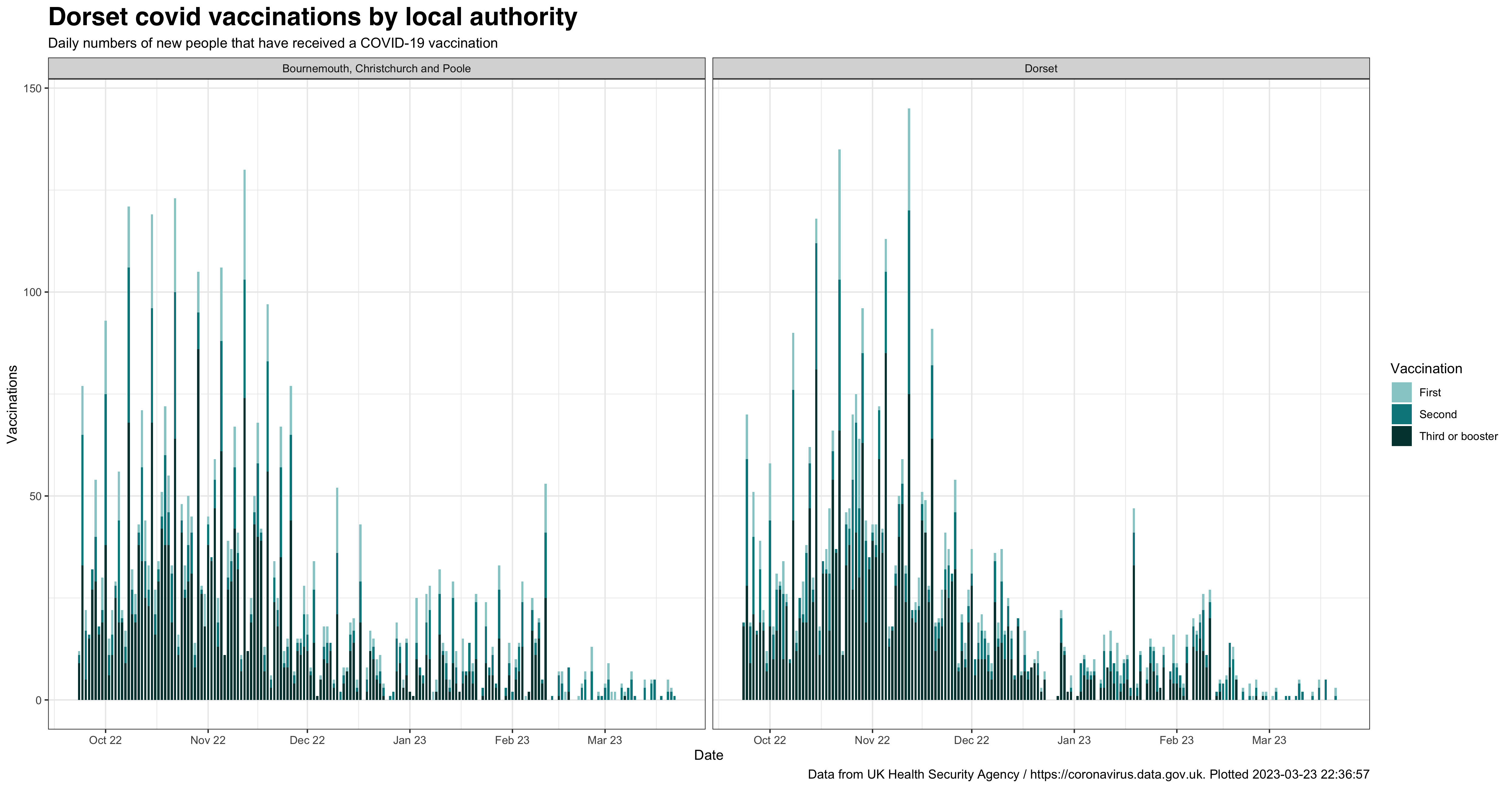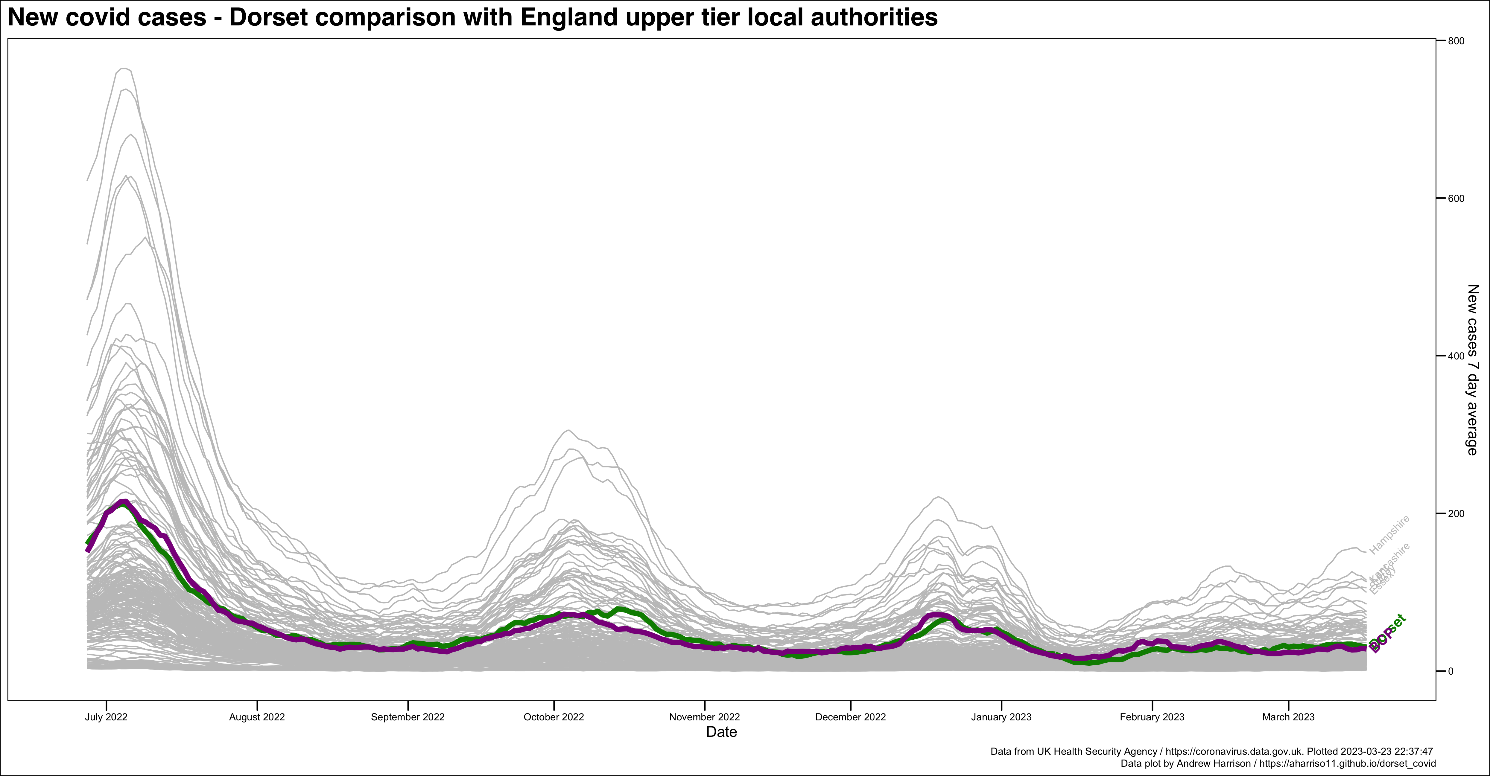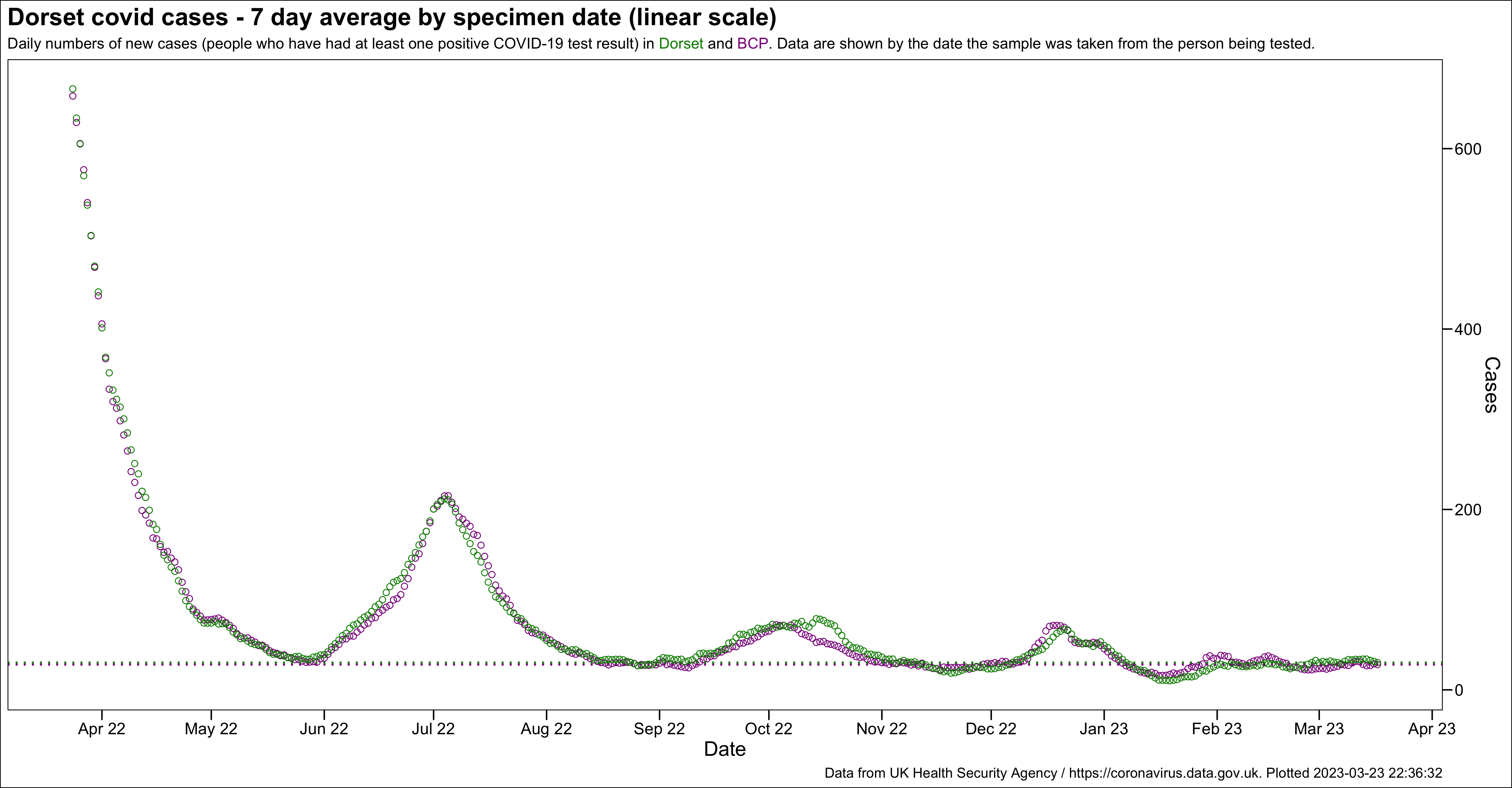 This is the output of me playing around with the R statistical programming language and the coronavirus data produced on a daily basis by the UK Health Security Agency (UKHSA) and published at https://coronavirus.data.gov.uk, focusing on the local authority areas of Dorset and Bournemouth, Christchurch and Poole.