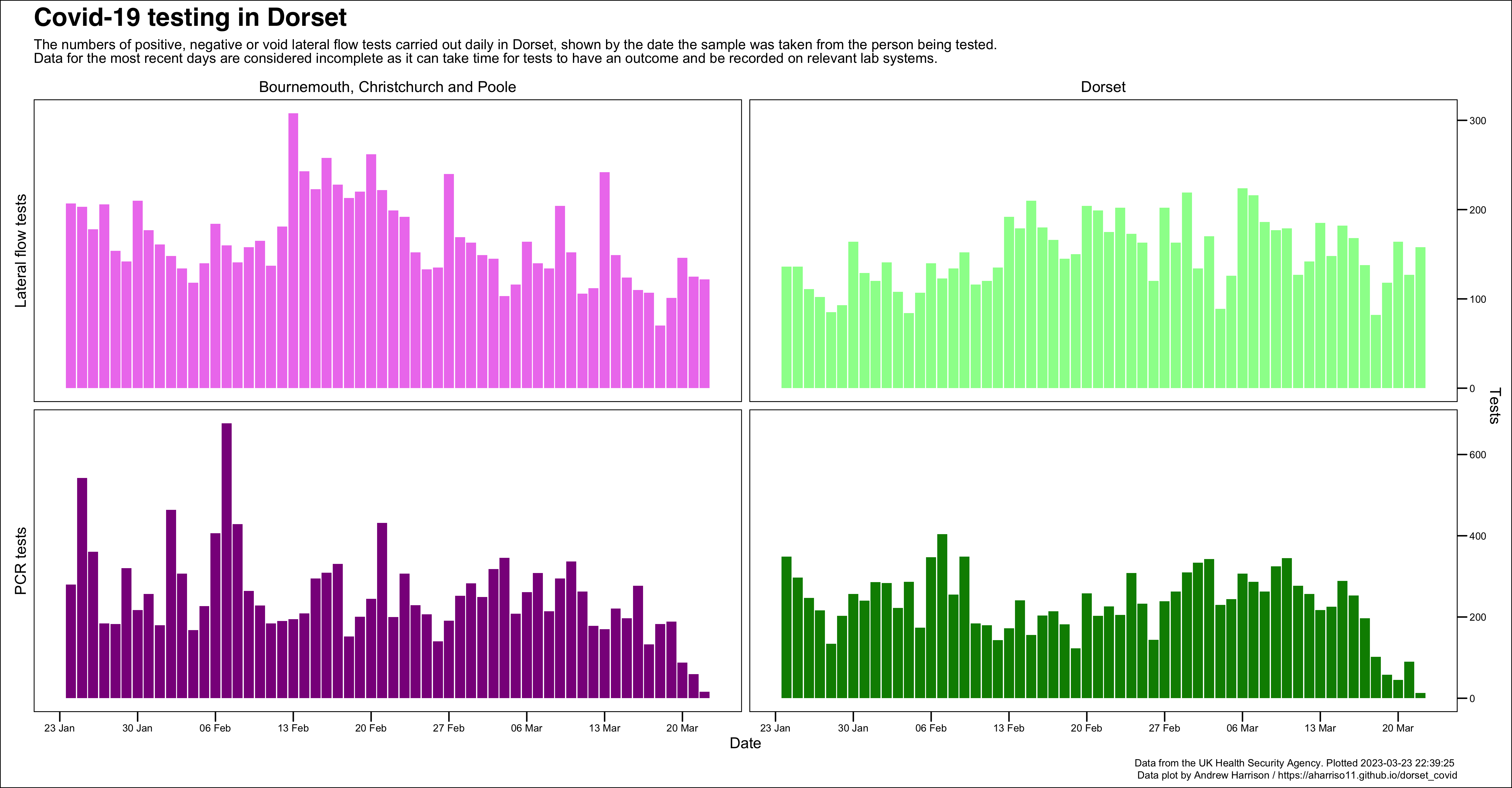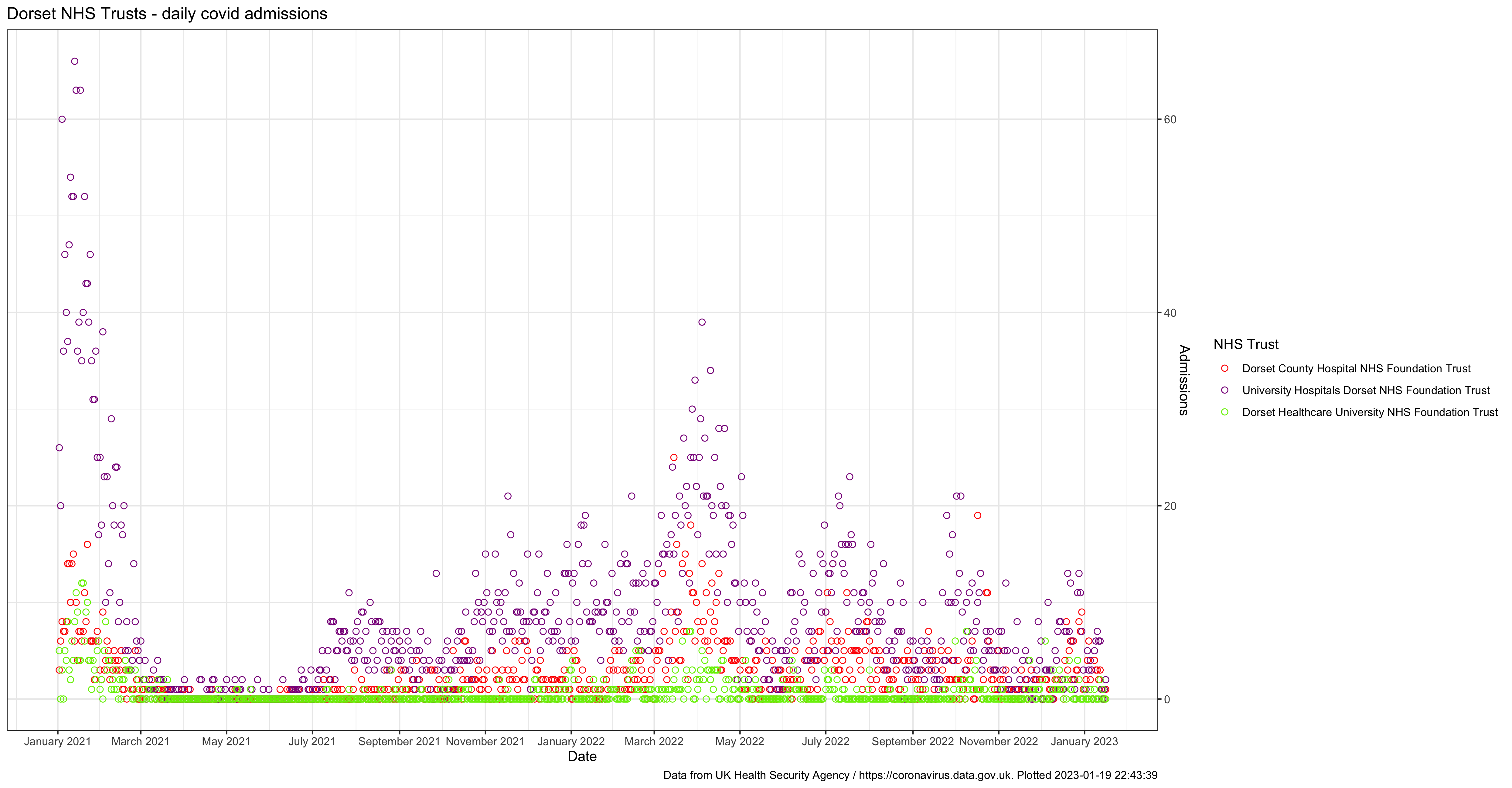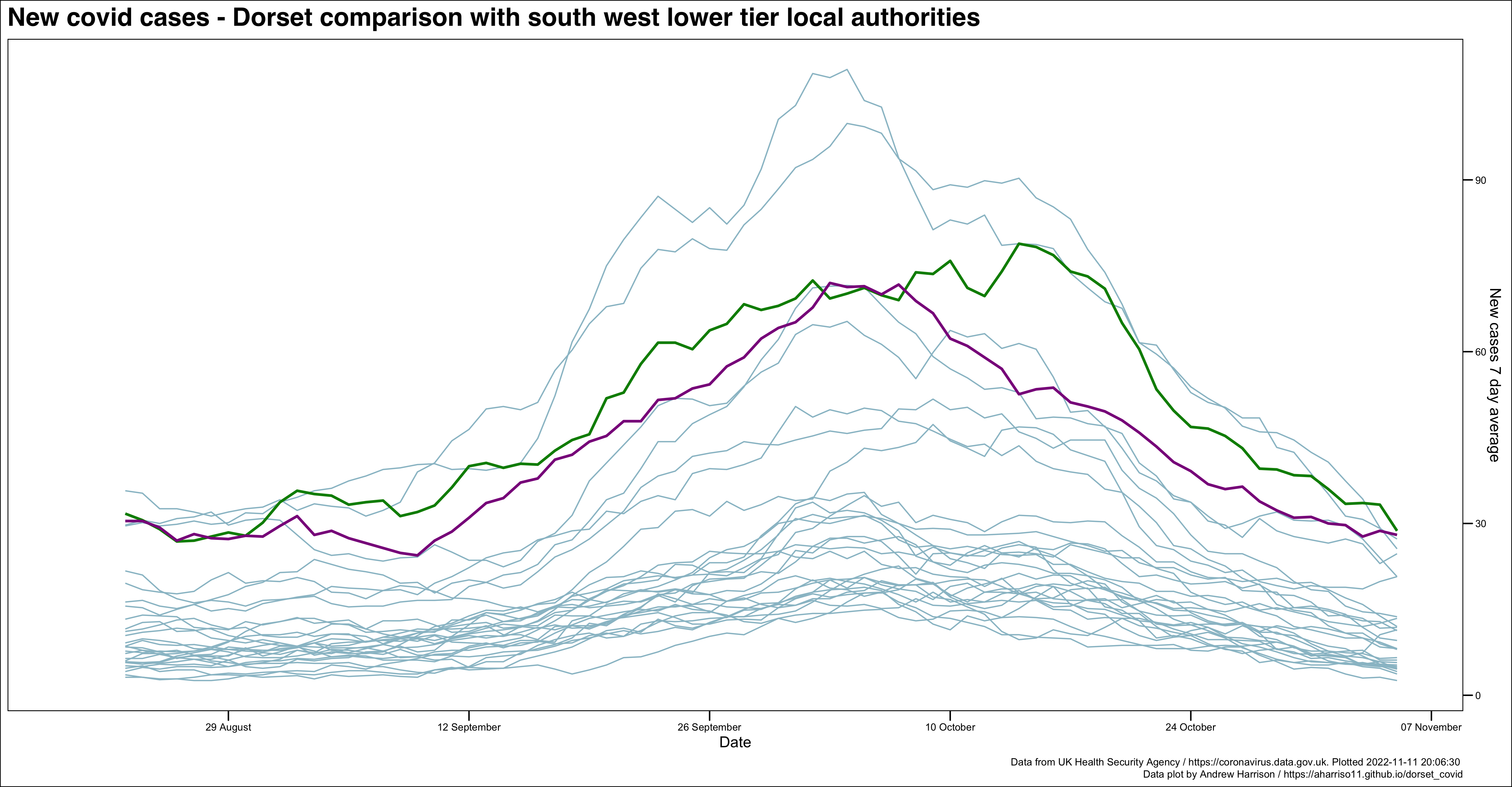 This is the output of me playing around with the R statistical programming language and the coronavirus data produced on a daily basis by the UK Health Security Agency (UKHSA) and published at https://coronavirus.data.gov.uk, focusing on the local authority areas of Dorset and Bournemouth, Christchurch and Poole.