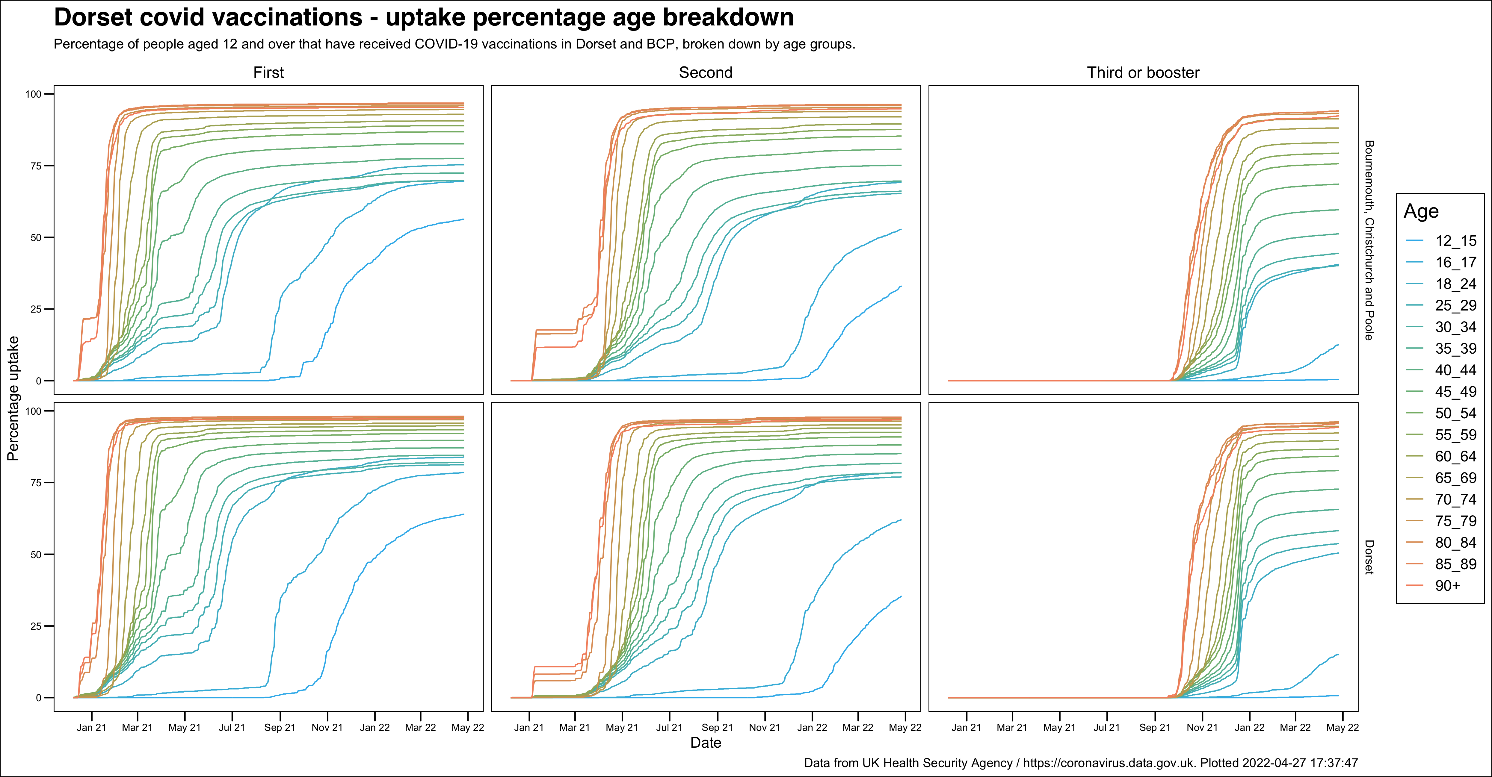 A selection of other data insights, usually updated on an irregular basis, can be seen on a separate page. Other insights currently include data plots of covid variant prevalence in England, vaccination uptake by age for Dorset, and mobility data from Google for Dorset.