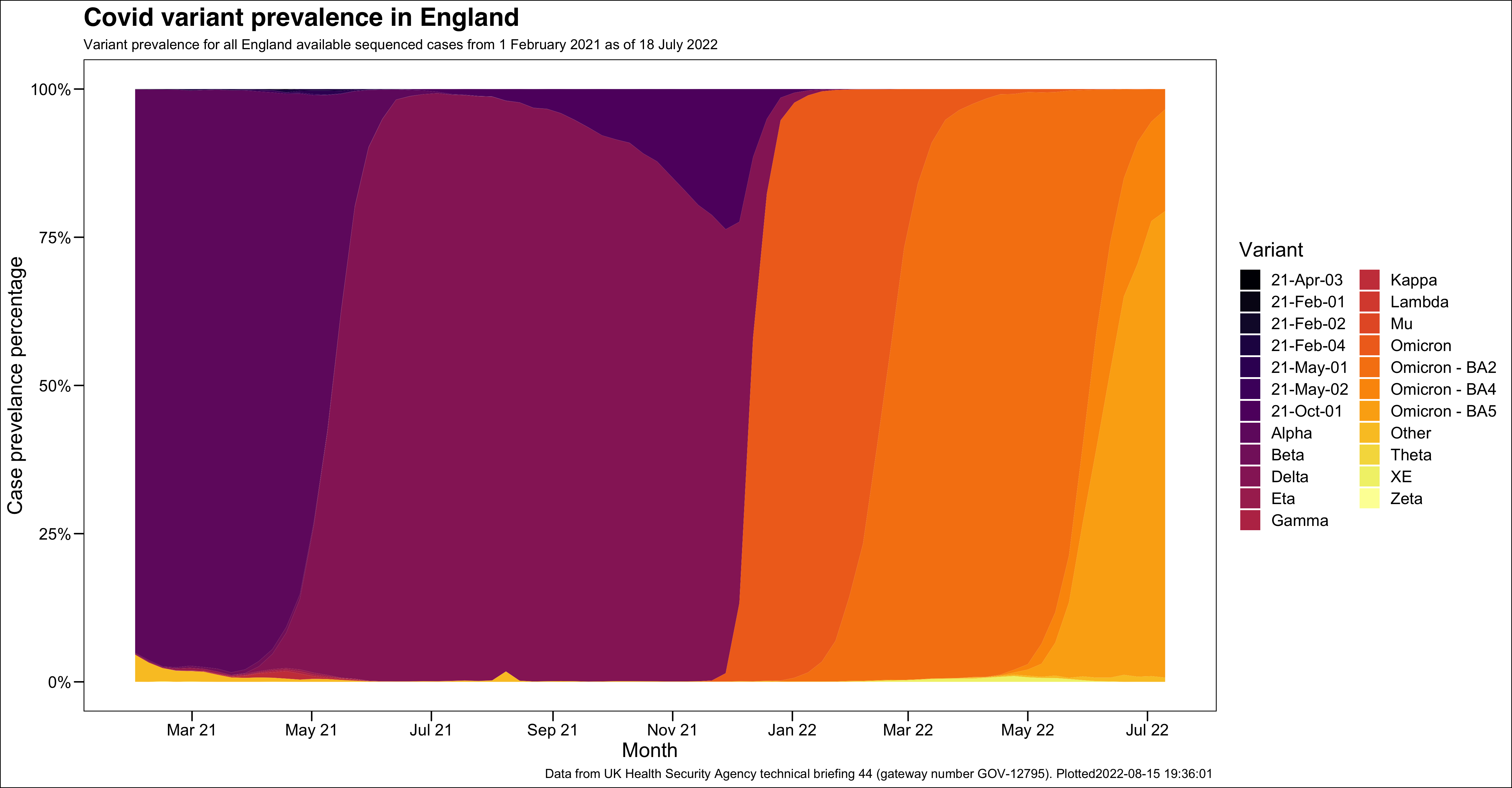 This data set is made available by the UK Health Security Agency as part of their covid technical briefings. These briefings are released fairly frequently but on an irregular basis. The most recent briefing (number 44) was released on 22nd July 2022 and provides information on cases sequenced between 1st February 2021 and 18th July 2022.